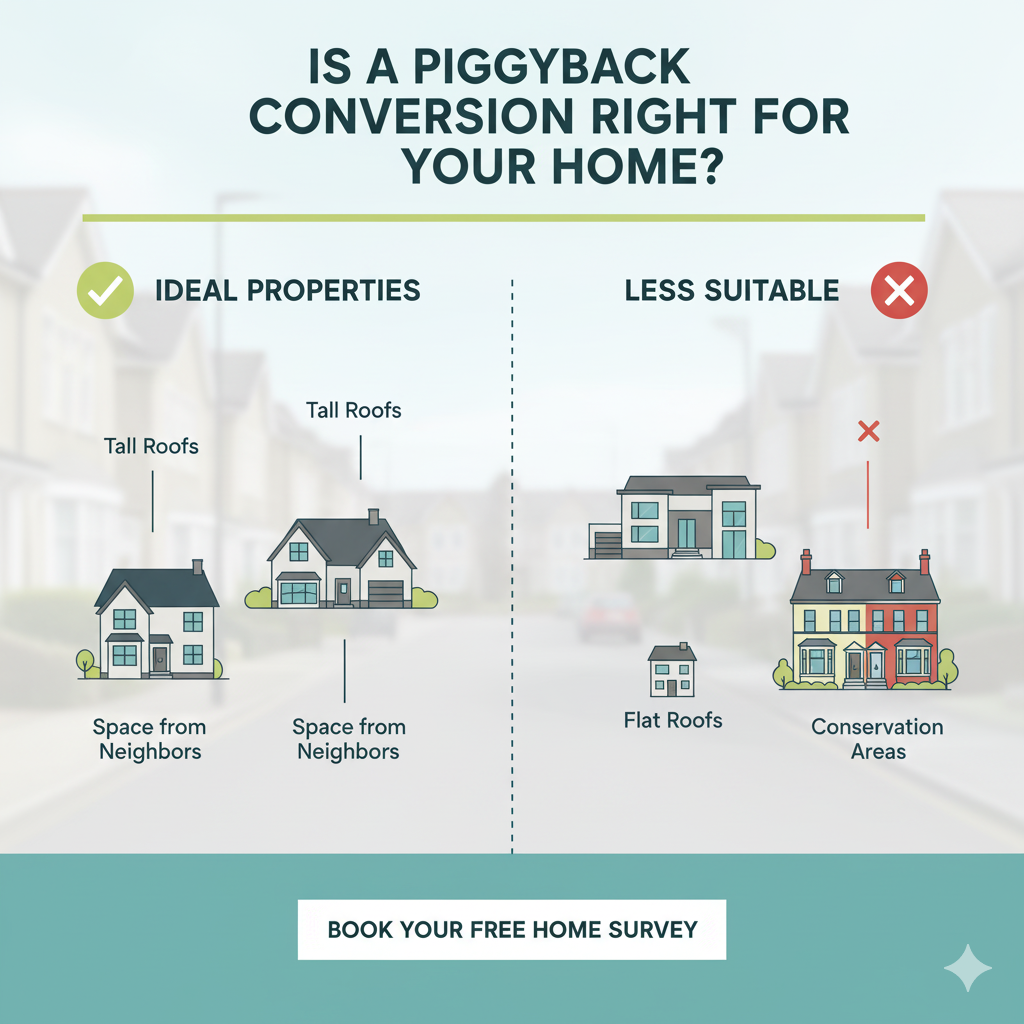 • Homes with Low Roof Pitches: If your attic has less than 2.2 metres of head height at its highest point, a piggyback is often the only way to create a usable room.